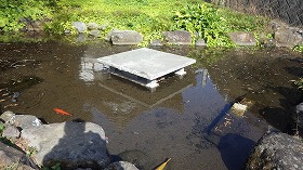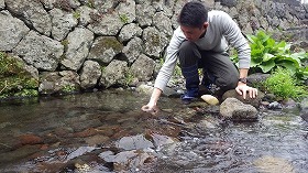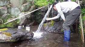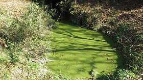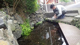 この写真の湧水池は沼津市や長泉町に点在する湧水池です。位置をGPSで確認し、PHやCODなどの水質をパックテストで行い、調査結果はグラウンドワーク三島のホームページに掲載されている「富士山湧水マップ」に最新情報を掲載しています。