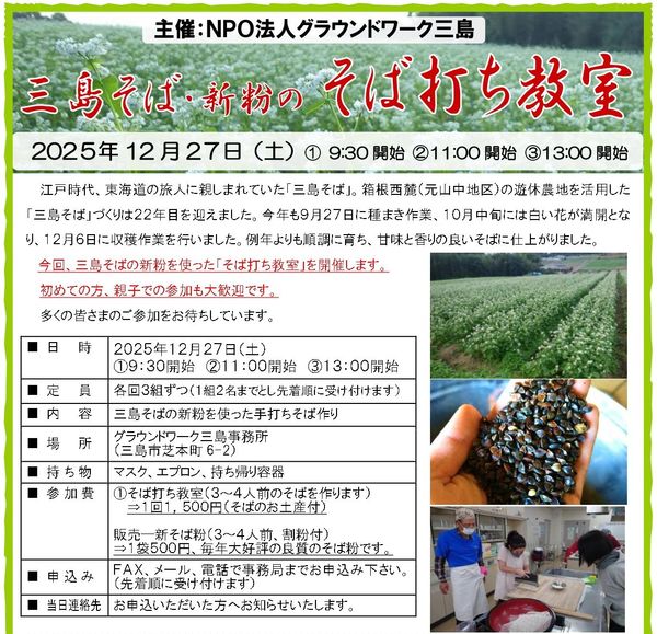 例年よりも順調に育ち、甘味と香りの良いそばに仕上がりました。 今回、三島そばの新粉を使った「そば打ち教室」を開催します。