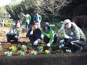 グローバル文化交流協会(GIA)の皆さんに指導いただき、草刈り、チューリップの球根やビオラの苗の植え替え、ガーデン内の小道のロープの張り替えを体験しました。