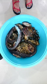 今回はホタテ・カキ、さらに立派な鱧(ハモ)も水揚げし、お昼ご飯と夜のBBQ食材にします。