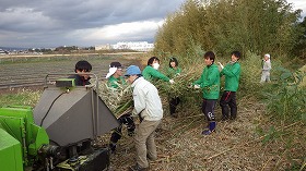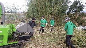 1日目は三島市御園の松毛川で河畔林再生のための竹林伐採・チップ化と休耕地の「復田」活動を行いました。