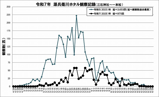 ・5月1日から6月25日までの延べ観察数は975匹です。
