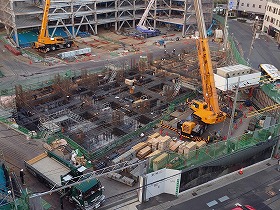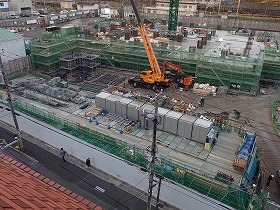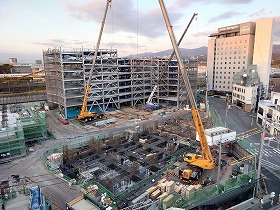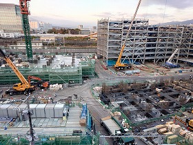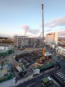 2025年12月3日(水)の三島駅南口東街区再開発事業の現場状況です。秀麗なる富士山を背後に抱く場所に、鉄骨とコンクリートの塊を積み上げています。この施設建設の効果が「水の都・三島」の顔・シンボルとして、三島のさらなる発展が期待できるのでしょうか?人々が集まる活性化施設として評価されるのでしょうか。