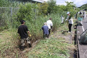 2日目は、大場里山地区メダカ池周辺の草刈り作業、余りにも暑いので急遽、瀬川御園町内会長にお願いして御園公民館をお借りしてのクールダウンと昼食、その後、私からのまちづくり・NPO活動の講義・意見交換を行い、午後から、松毛川千年の森づくり・植林地の下草刈り、今回のボランティア活動の振り返り、まとめを行いました。
