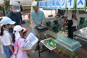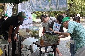 本日早朝に、源兵衛川で魚類やサワガニ、ミシマバイカモを採取して、水槽に入れて見てもらいました。皆さん、こんなにも沢山の生き物が、源兵衛川で生きていることに驚いていました。