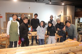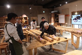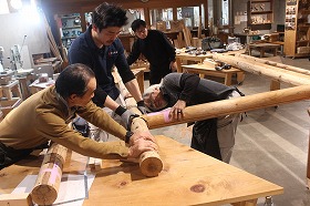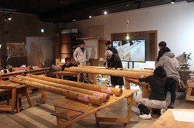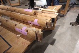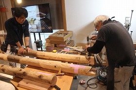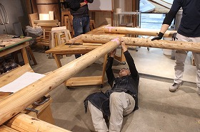 平成建設さんのベテランの大工職人さんの指導のもと杉の木が、鳥居に組み立てられるように加工していきました。最初は、この作業が何のためにしているのか理解できませんでしたが、次第に形が決まってくると、この部材がこの溝に入り、組み立てられていくんだと納得できました。職人さんたちは完成図が頭の中にしっかりと入っており、効率的に加工作業を進めていました。