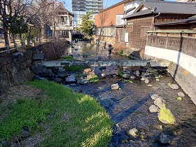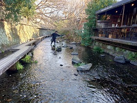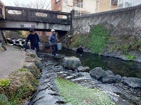 2026年2月13日(金)松毛川での竹垣の竹材製作後、源兵衛川にホタルの餌であるカワニナを放流しました。これで3回目、三石神社まできました。