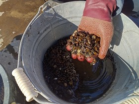 実は昨今、源兵衛川ではカワニナの生息をほとんど確認できず、また、この減少の原因もよくかわりません。そこでホタルの保護・生息継続を優先して、カワニナの緊急放流・補給を実施しています。