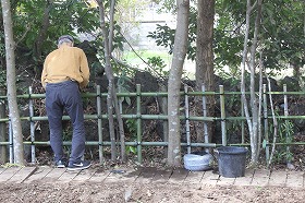 2026年2月26日(木)午前10時から、宮さんの川・ほたるの里の竹垣の棕櫚巻きとほたる水路の土手への土入れ作業を行いました。これらの作業により、水辺の景観がブラッシュアップし、ほたるの幼虫が土繭をつくれる柔らかい法面を整備できました。