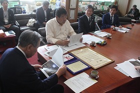 2026年4月22日(水)午前9時から「第29回地球倫理推進賞」受賞に係り、豊岡武士三島市長への報告に、小松理事長・小野副理事長・塩川三島市倫理法人会会長・石井推薦人とともに行って来ました。