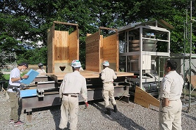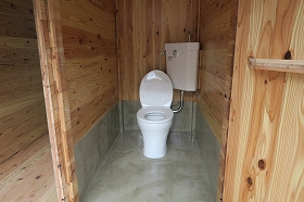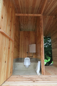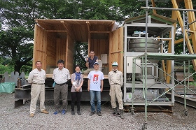 夕方には見事に木製トイレの組み立てが終わり、洋式・和式のトイレが設置され配管類も接合され、機械の稼動に合わせて順調に洗浄水が循環しました。今回はし尿は流しませんが水を流すことによって「循環システム」の稼動状況を確認・調整していきます。