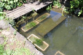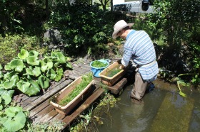 今回、三島バイカモの里内の各湧水池に三島バイカモを増殖すべく、プランターに移植し、池内に沈めました。来月には白い花々の咲き乱れる姿が鑑賞できます。