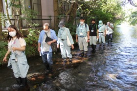 令和3年10月4日(月)、午後から源兵衛川の「施設調査」を東部農林事務所と三島市農政課職員の皆様と実施しました。「水の散歩道」は湧水の増水により水没、川沿いの各所から湧水が噴出し、涼やかな川風が吹き過ぎ、やはり三島の宝物はこの清冽な湧水と豊かな水辺環境だと実感しました。