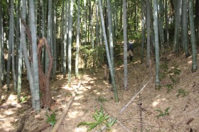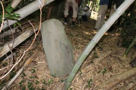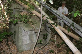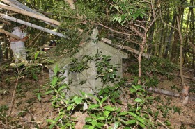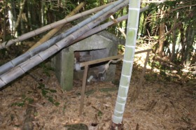 荒廃した参道を探しながら急傾斜の山道を徘徊し、やっと山頂に辿り着き、竹林の中に発見しました。2年ほど前に確認に来た時よりも、竹が覆い被さり、一部が破損し痛々しい状況でした。