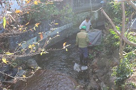 多くの来訪者が通る水の散歩道、しかし、雑草が見受けられて景観上醜くなっていました。草を刈り、土溜まりをならし流れを整え、川底のゴミを拾い、落葉を下流に流して、川沿い全体の水辺空間を綺麗に整えました。