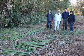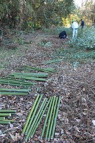 2023年12月25日(月)午前10時から、三島梅花藻の里の竹垣に使用する、新しい竹材を松毛川近くの竹林において切り出し作業を行いました。全体で約200本の竹材を伐採・加工しました。あわせ、隣接地の耕作放棄地の草刈りも行いました。午後2時半までかかり、私の電動草刈り機のバッテリー3個使用してひどく疲れました。