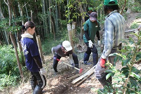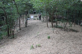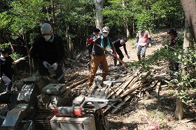 しかし、加和太建設さんの若手職員さんや都留文科大学の林丈雄非常勤講師の「環境保全と自然再生」の受講生たち、グラウンドワーク三島のボランティア・サポートグループなどの支援を受け、山頂部に切り残しておいた竹をハンマーで割り、チッパーに投入・破砕、それを周囲にばら撒き、見違えるように綺麗になりました。