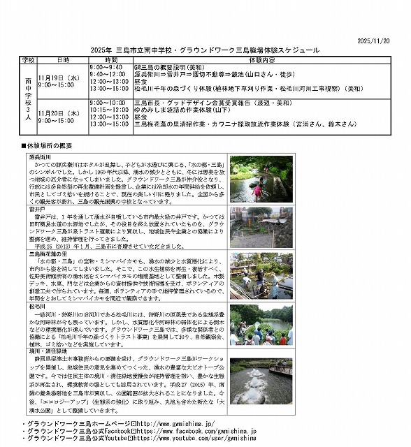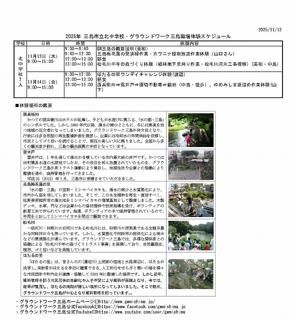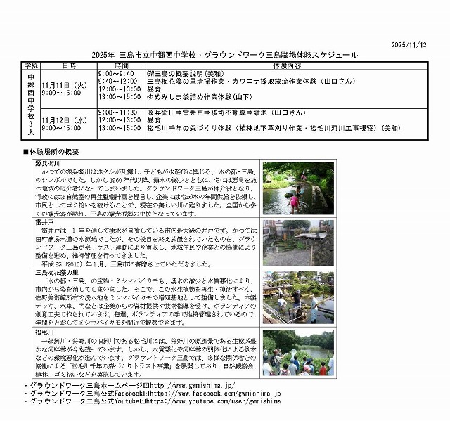 2025年11月11日・12日ー中郷西中学校・3人、11月13日・14日ー北中学校・2人、11月19日・20日ー南中学校3人計8人の中学生が、グラウンドワーク三島に職場体験に来てくれました。