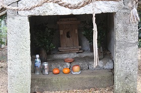 また以前放置竹林に覆われて枯れかけていた「シロタブ」の巨木が蘇り、大きく緑の羽を広げています。「霊(たま)が宿る木」とされ、先人が石祠横に植えたものと推測されます。