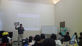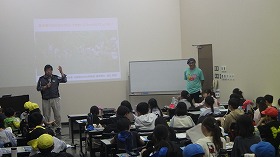 「三島が汚れていた頃大人たちは水の都・三島はもう終わりだと諦めていたこと、汚れた川に実際に入りゴミを拾う人はすくなかったこと、川遊びはいいが魚やサワガニは必ず川に戻すルールを守ってほしいこと、川が綺麗だったりほたるが飛び三島バイカモが咲いているのはそれを影で守っている人たちがいること、難しい問題を調整して皆で仲良くまちをよくするグラウンドワーク三島のような市民団体が大切なこと、源兵衛川の水は東レさんからの水が供給されていること」などをお話しました。
