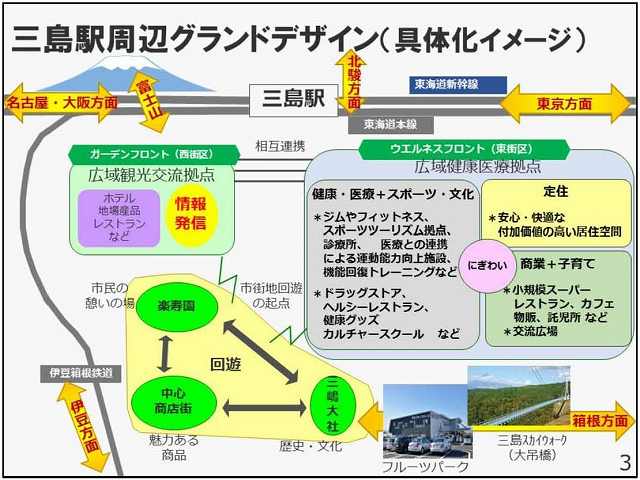 三島市が考える三島駅南口周辺の仕掛けです。西街区の広域観光交流拠点の現実の姿は当初の計画と違い、人々が往来する賑わいは夢物語・幻想です。