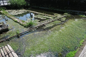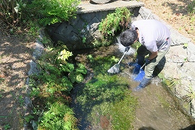 本日は三島梅花藻の里の定例作業でした。猛暑で熱風が吹く中で2時間ほどの作業を行いましたが、やはり以前流入した泥水が、バイカモの藻の中に付着して掃き取るのに手間がかかりました。