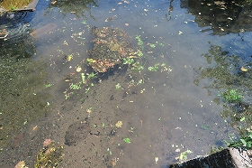 洗い流すために噴水は1日中稼動するように調整しましたが、一部の藻は腐ってしまいました。この清掃作業を続けることにより、元通りの状況への再生復活を願って作業を続けます。三島市と請負業者の環境配慮のいい加減さには呆れていますが、壊すことは一瞬ですが、再生復活させることは長い時間と我慢、地道な取り組みが必要とされます。