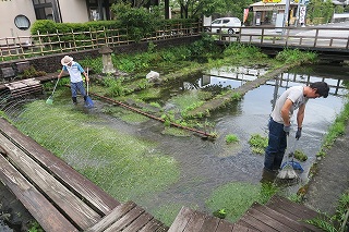 令和2年9月3日午前10時より「三島梅花藻の里」の定例整備を行いました。台風の影響で時々激しい降雨に見舞われて全身濡れてしまいました。