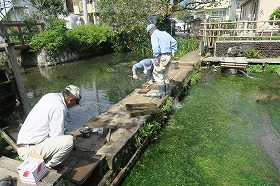 令和2年9月30日「三島梅花藻の里」の見学用歩道の改修整備作業を実施しました。遊水匠の会の皆様の専門技術により、歩道が少し腐り、欠け、固定のビスも外れてガタガタし歩きにくかった歩道が素敵に改修されました。