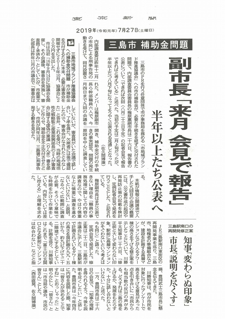川勝知事の了解を得られる確信もない中で、200億円ものリスクの高い大規模事業を強引に推進しようとするのは市政の暴走です。禍根を残します。市会議員も川勝知事に会い、知事の意向・本音を直接的に聞き取り、市長の発言の事実関係を確認する必要があります。