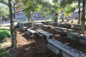 現場発生材や間伐材を破砕・粉砕した敷材であり、木の香りが漂い、緑陰の中が、心・気分落ち着く暖かい雰囲気に変身しました。皆様もこの「ホットスポット」の素敵さを満喫に来てください。隣には美味しいコーヒー屋さんもありますよ。