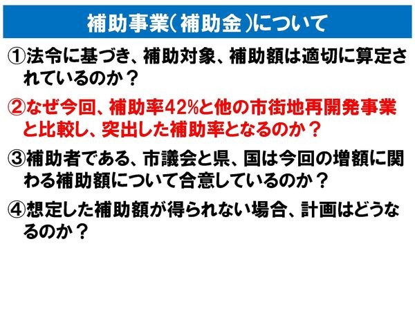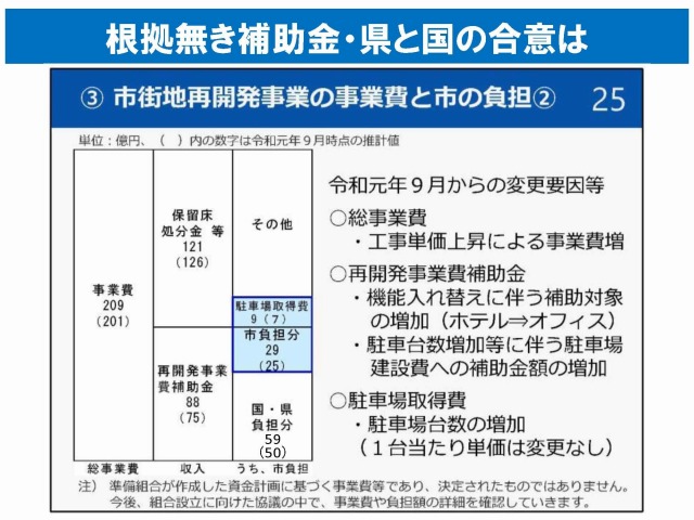 他地区の事例では補助金は30%程度です。県や国との事前相談・調整もせず、市政の暴挙・詐欺ともいえます。補助金が受けられなかったら60億円+24億円+工事費増8億円もの市民負担となります。